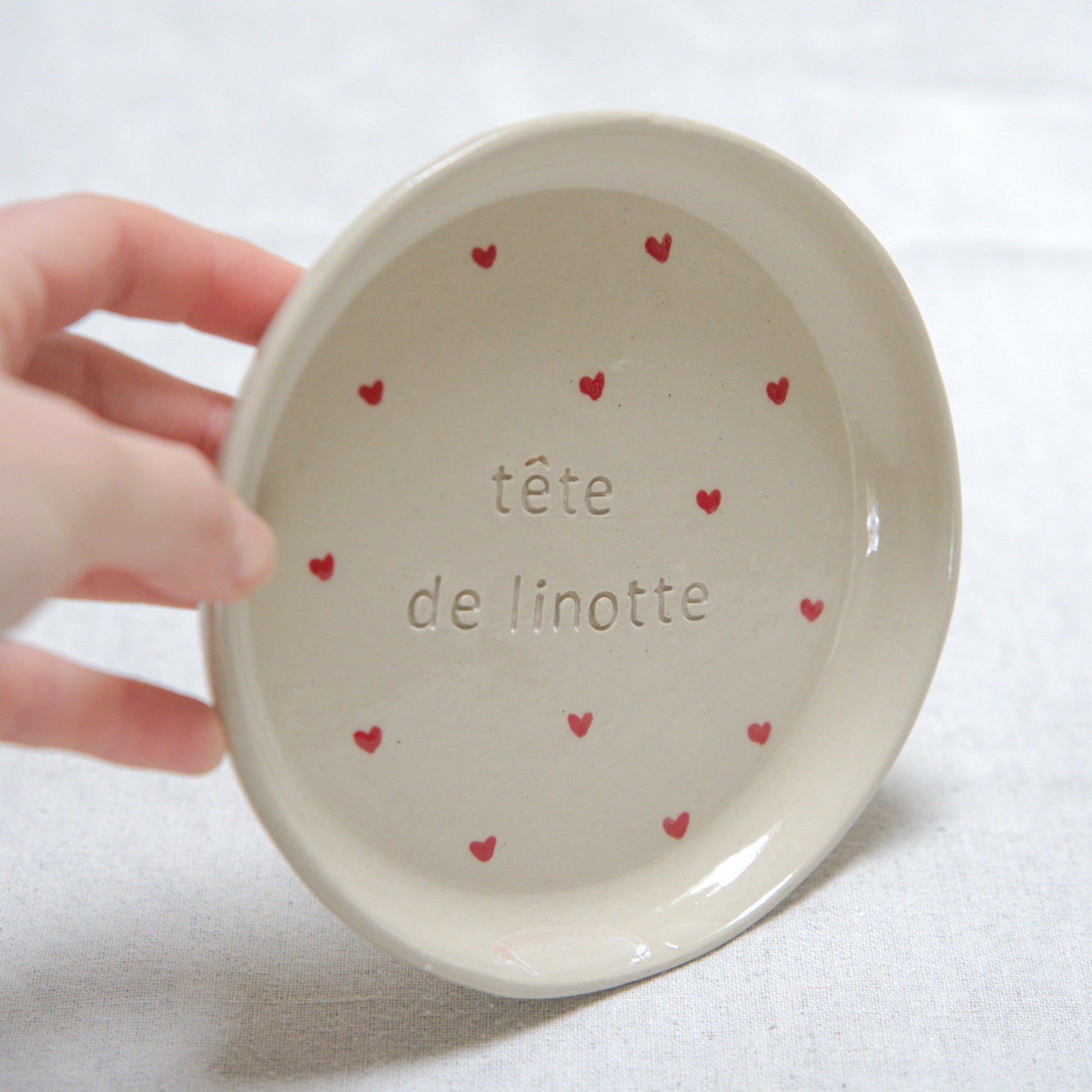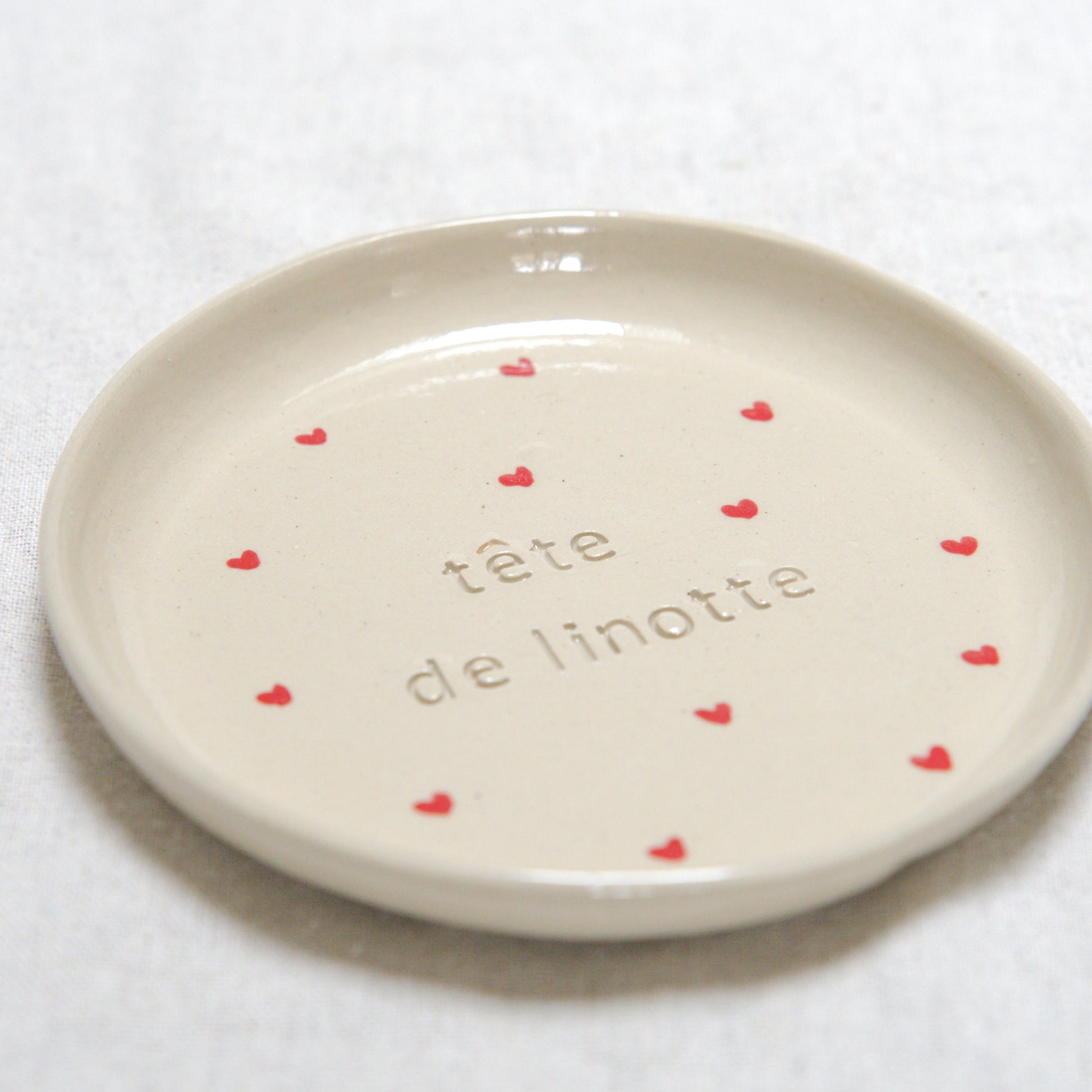 Une petite assiette ornée de l’inscription "Tête de linotte", tendre et un brin moqueuse. Parfaite pour un dessert, une viennoiserie ou une petite attention pleine de caractère.