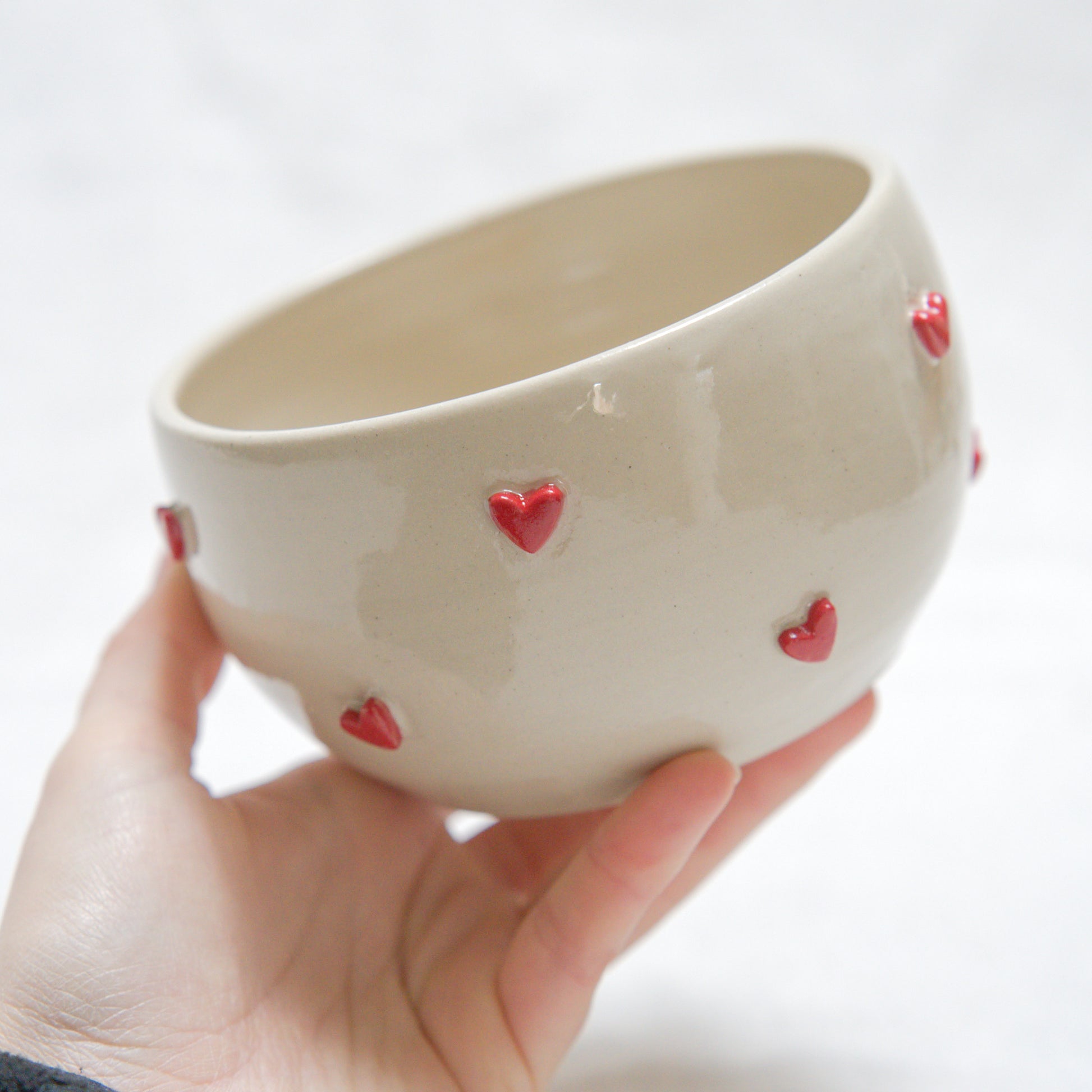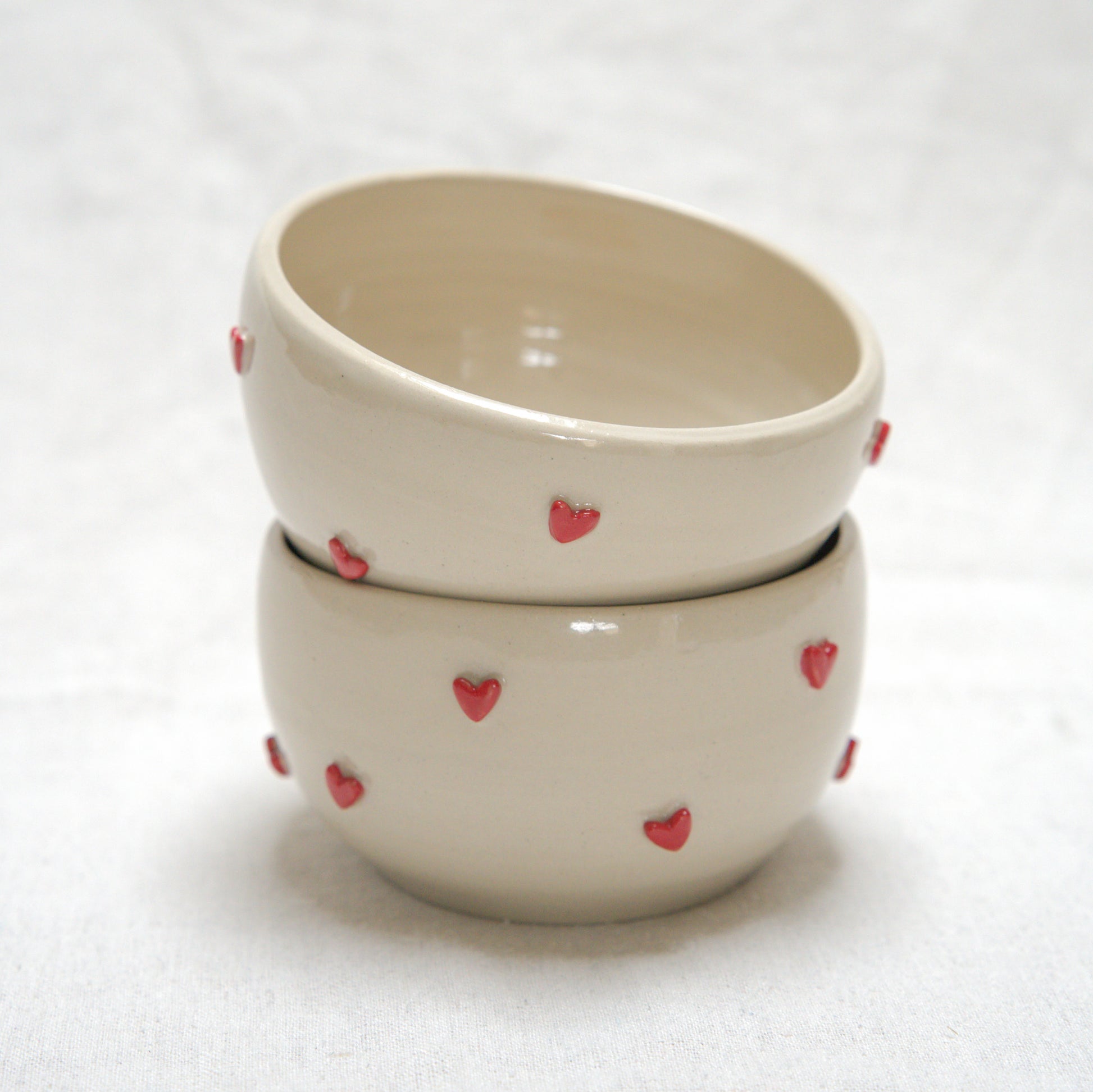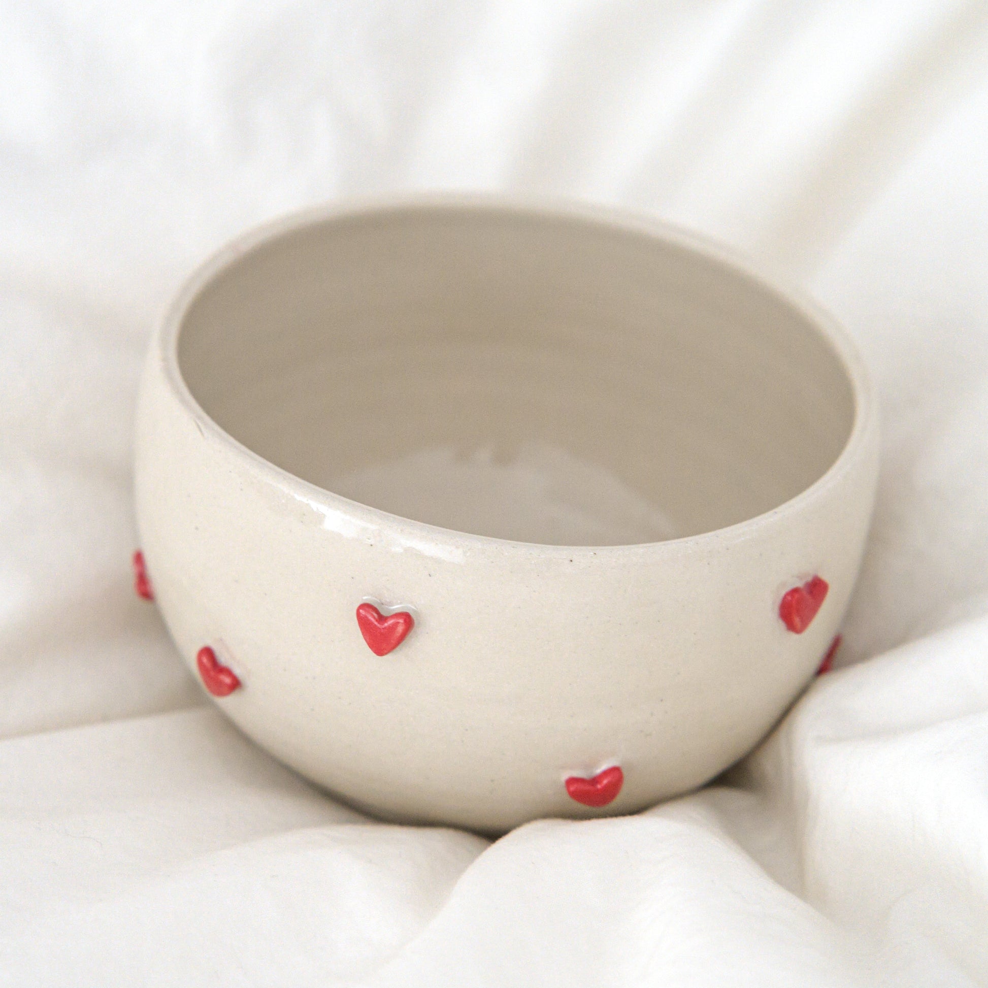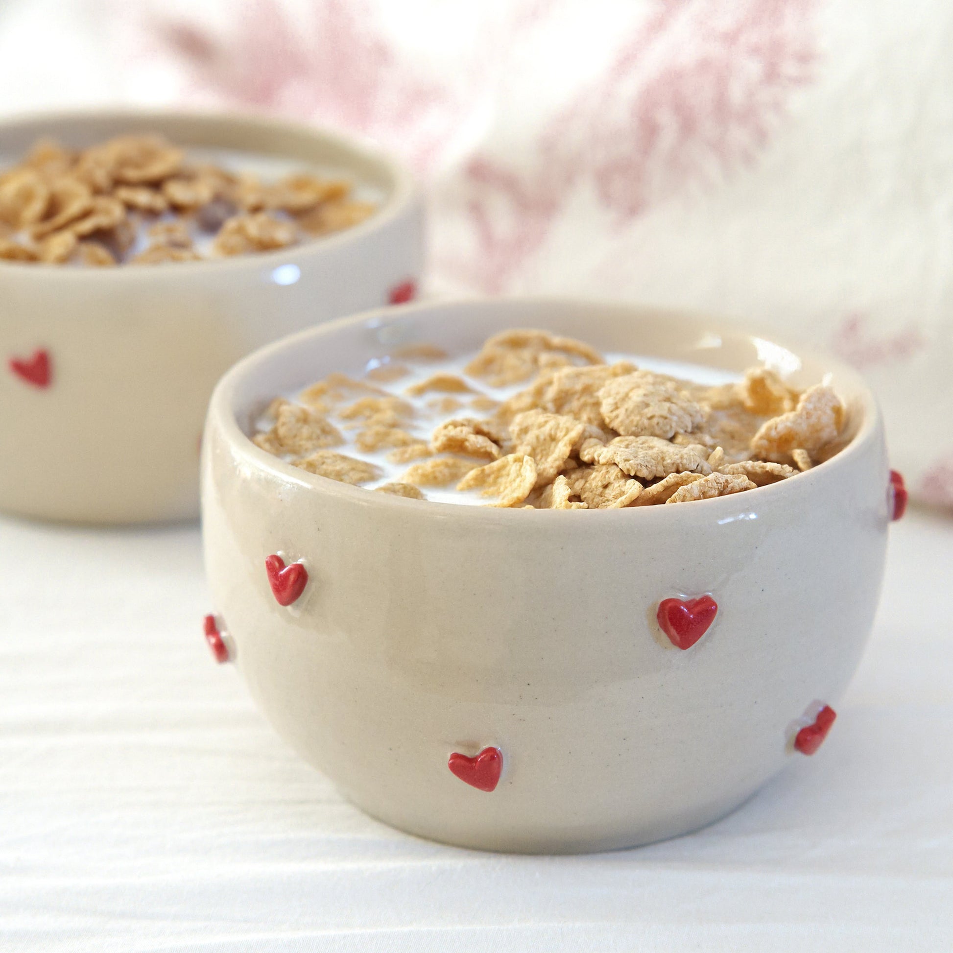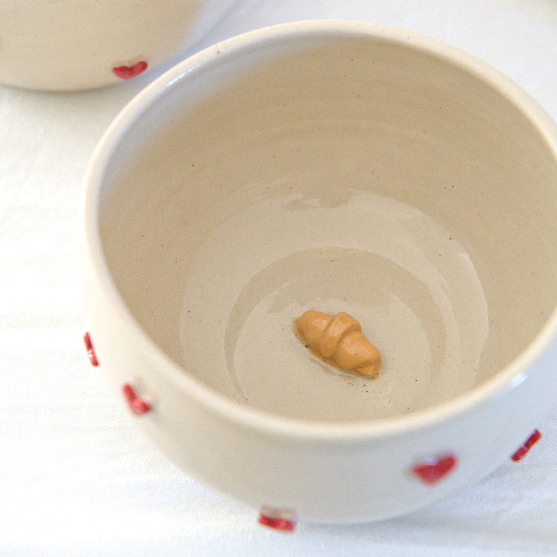 Des bols décorés de petits cœurs en relief, avec un petit croissant caché au fond. Une surprise délicate qui se dévoile au fil du petit déjeuner, pour un moment tout en douceur.