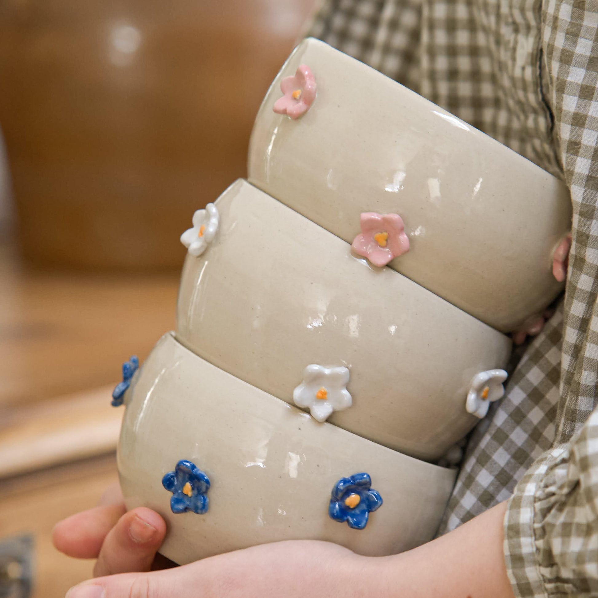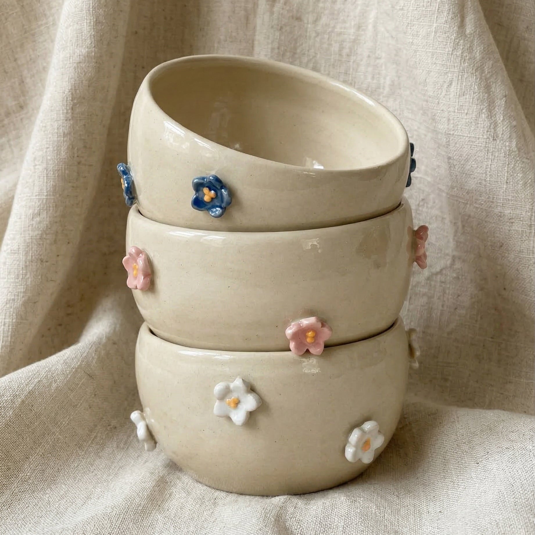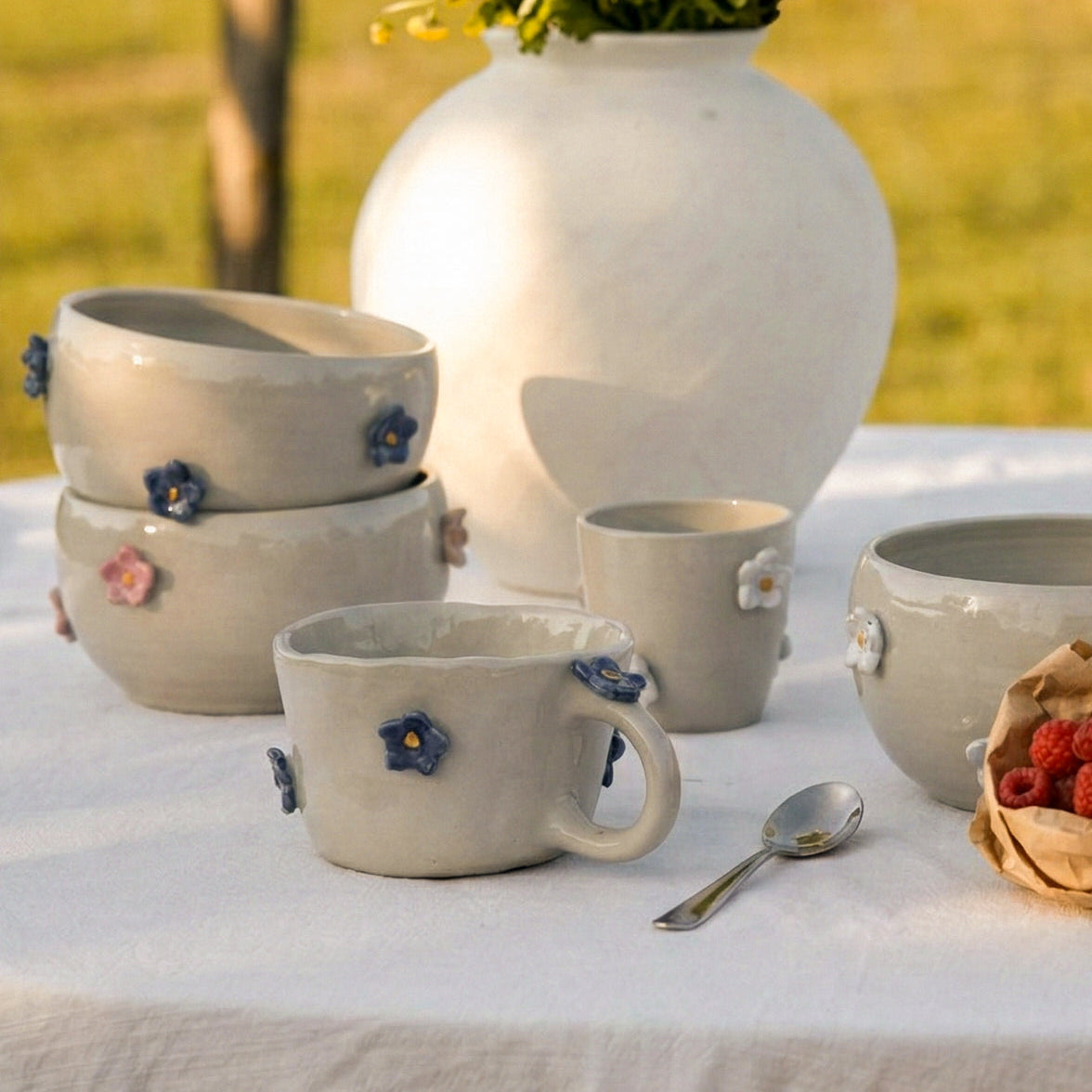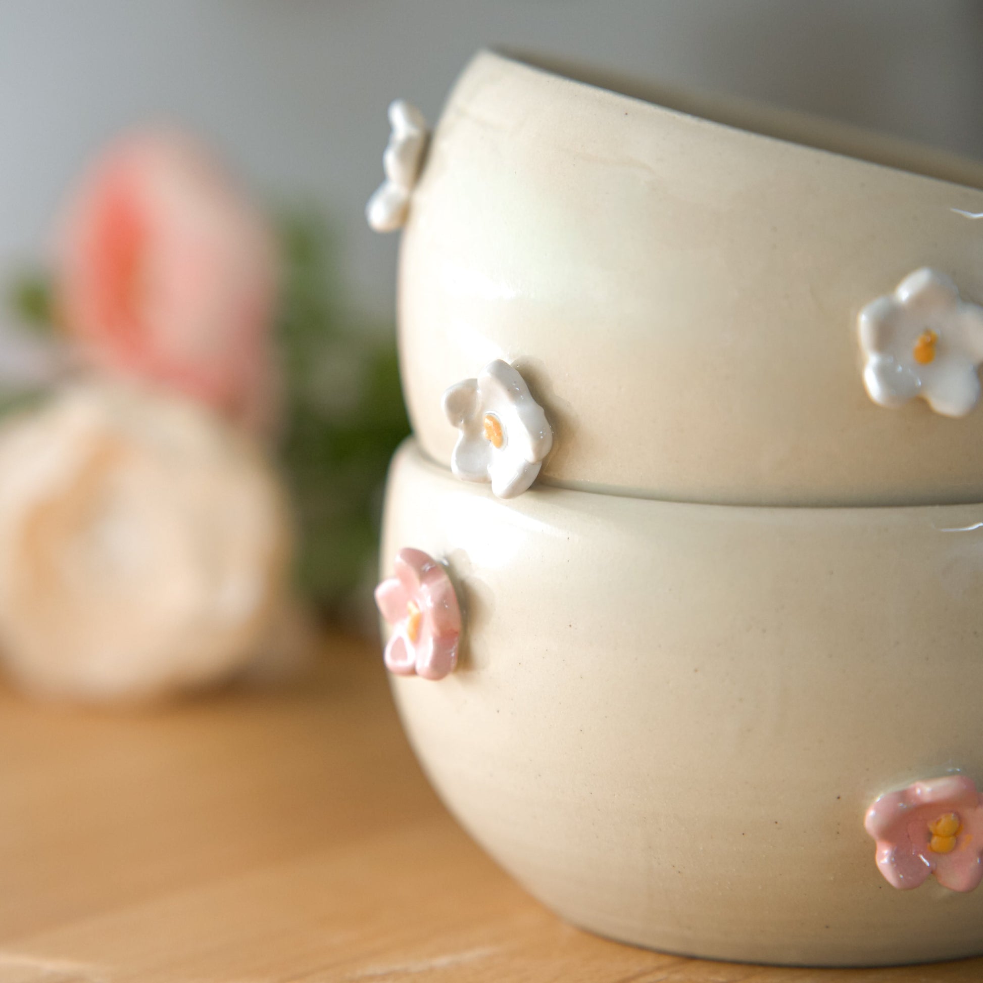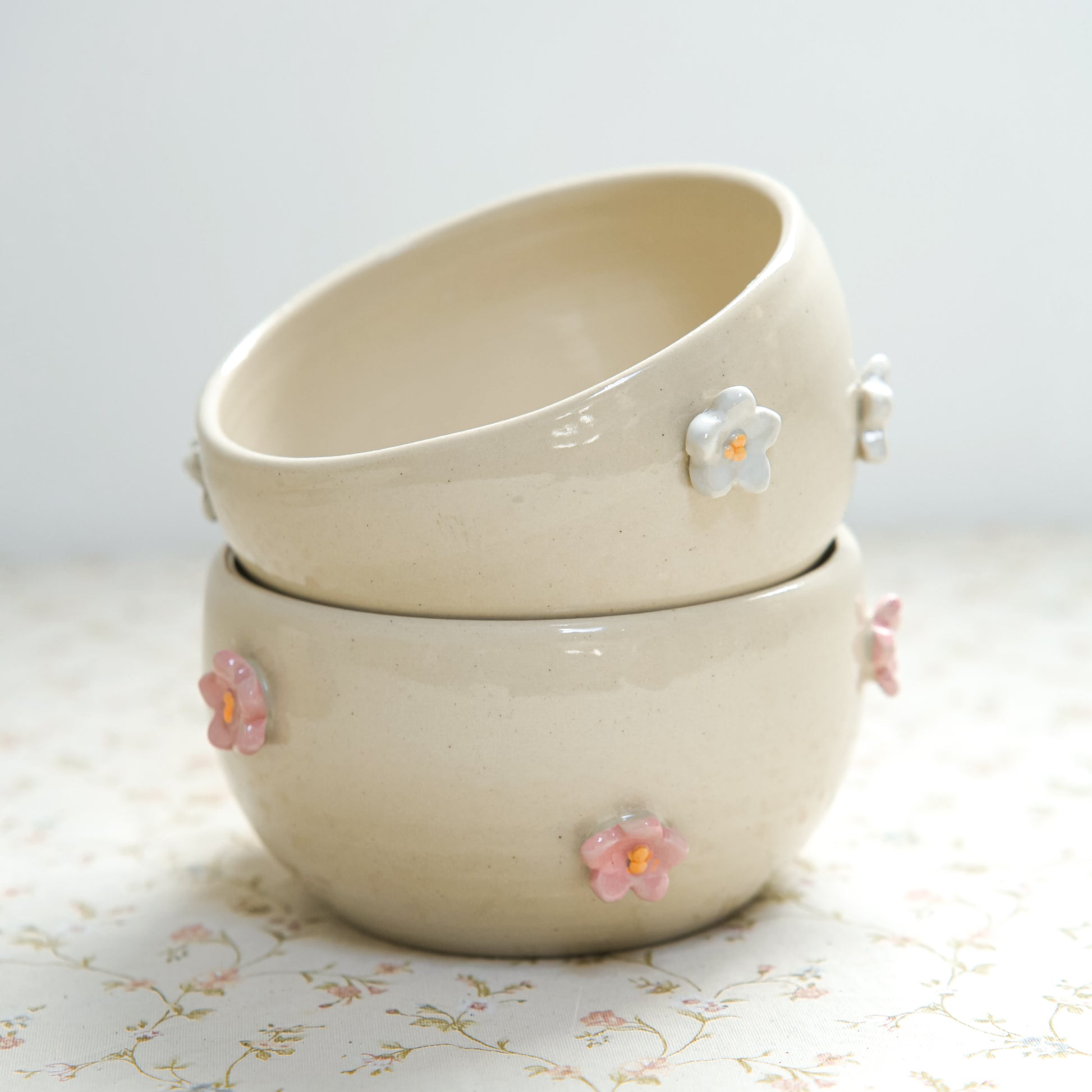 Des bols décorés de petites fleurs en relief pour un petit déjeuner tout en douceur.